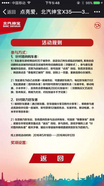 在北汽绅宝X35上市之初,推出大型H5活动,35座城市助力游。